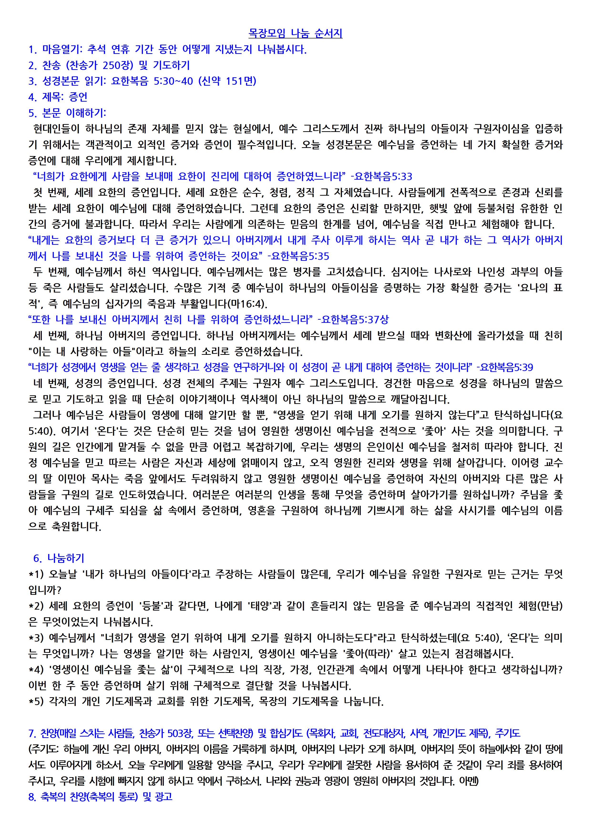 목장모임 순서지입니다.(요5, 증언)