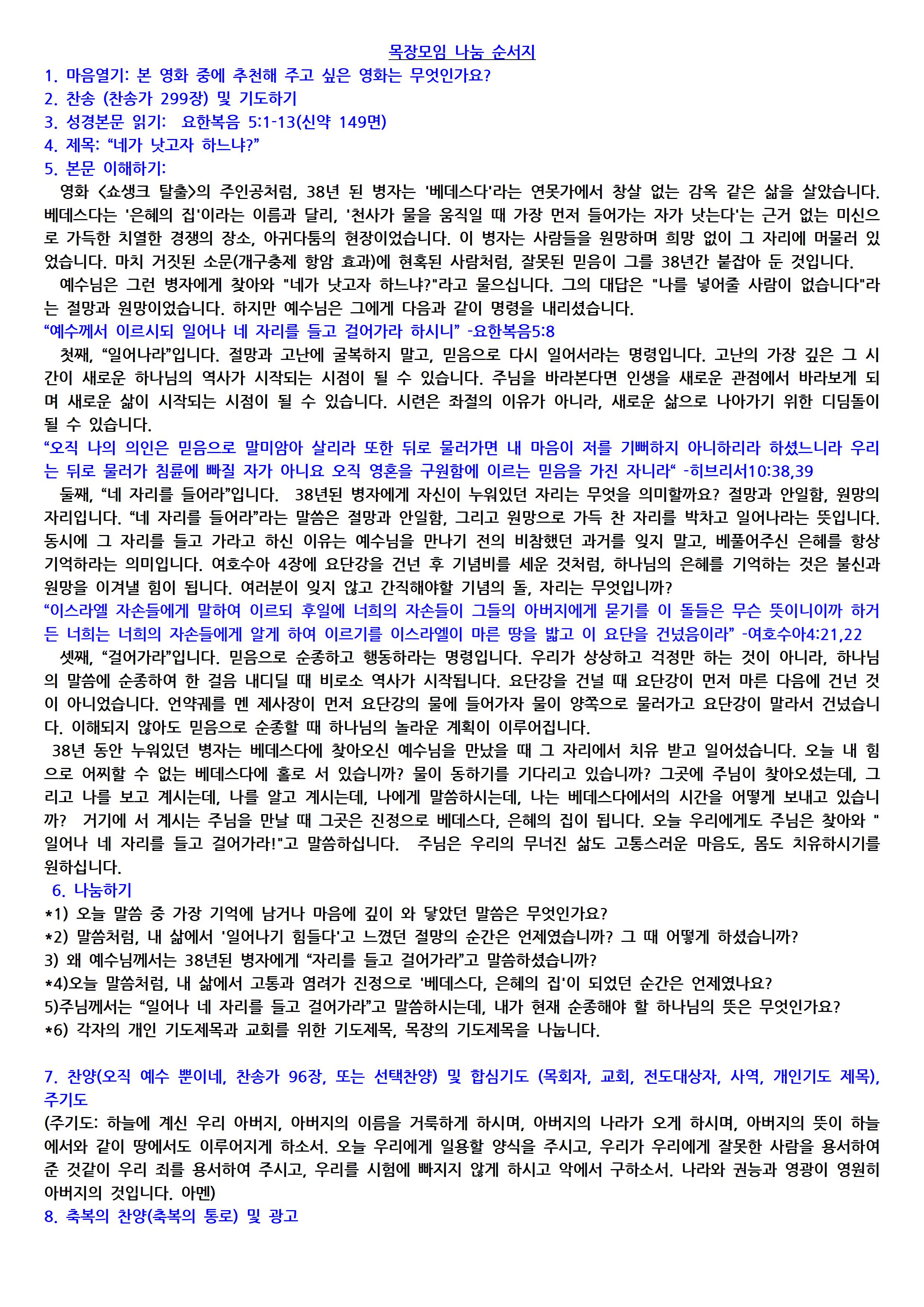 목장모임 순서지입니다(요5, 네가 낫고자 하느냐?)