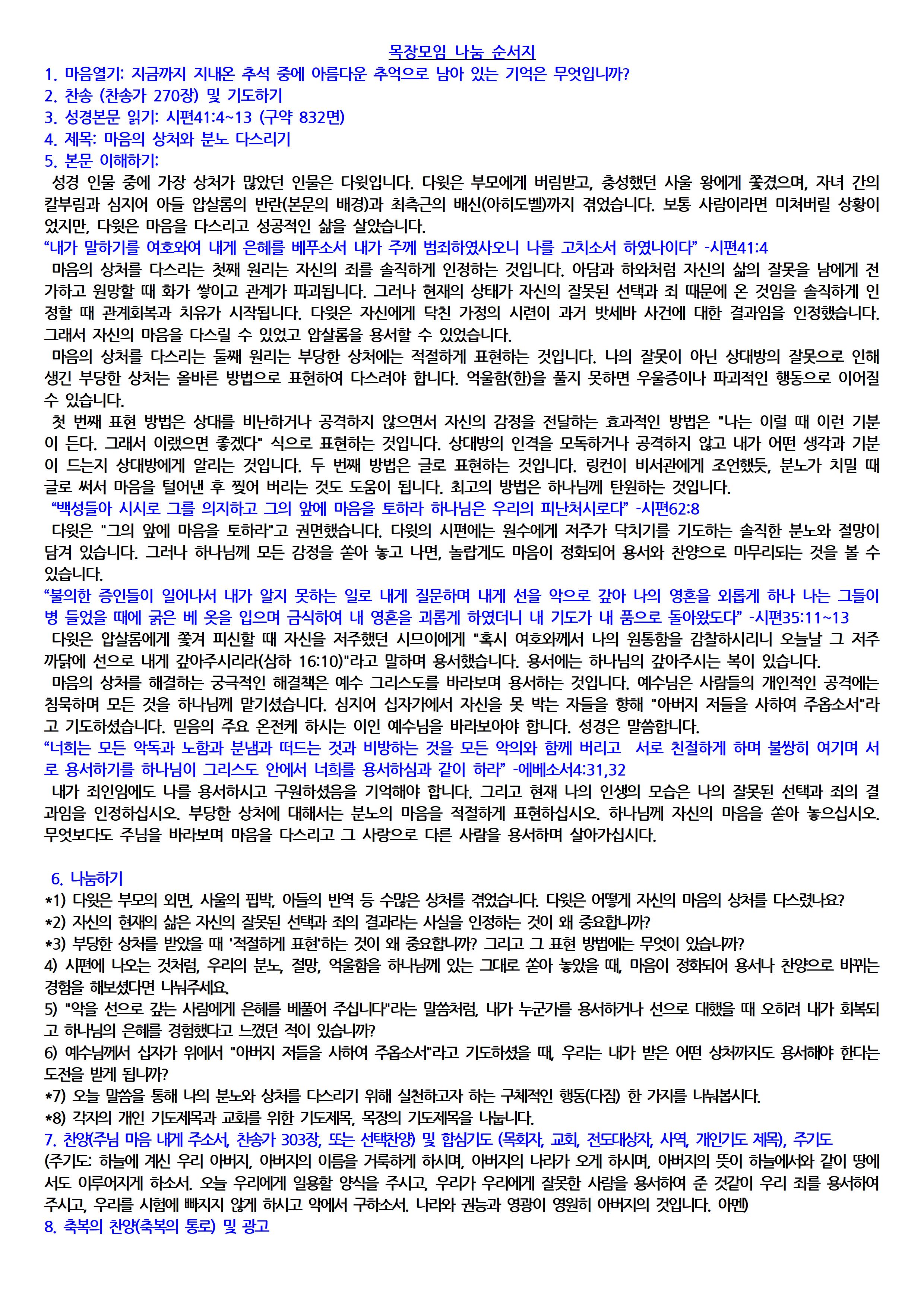 목장모임 순서지입니다.(시41 마음의 상처와 분노 다스리기)