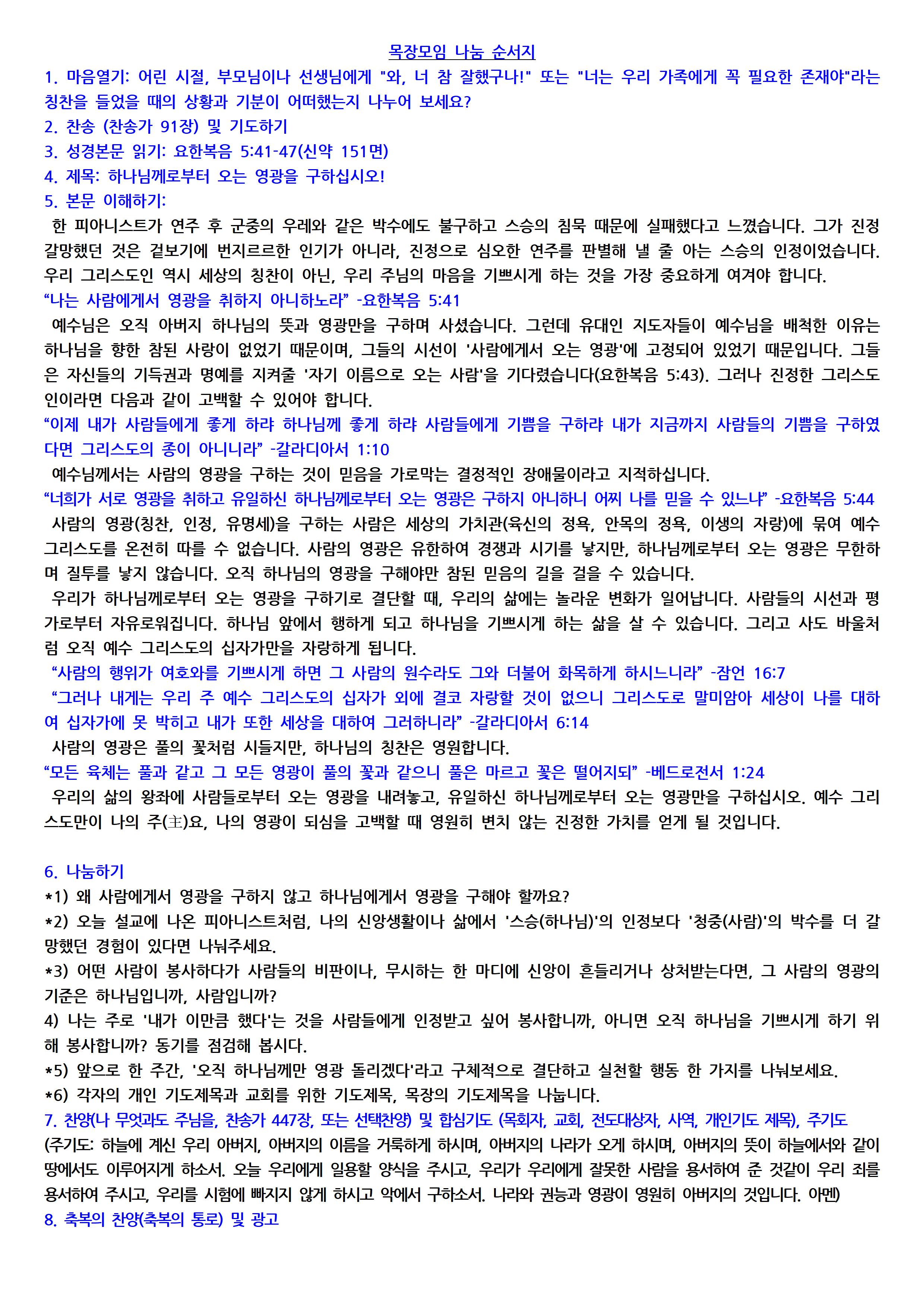 목장모임 순서지입니다(요5 하나님의 영광을 구하십시오)