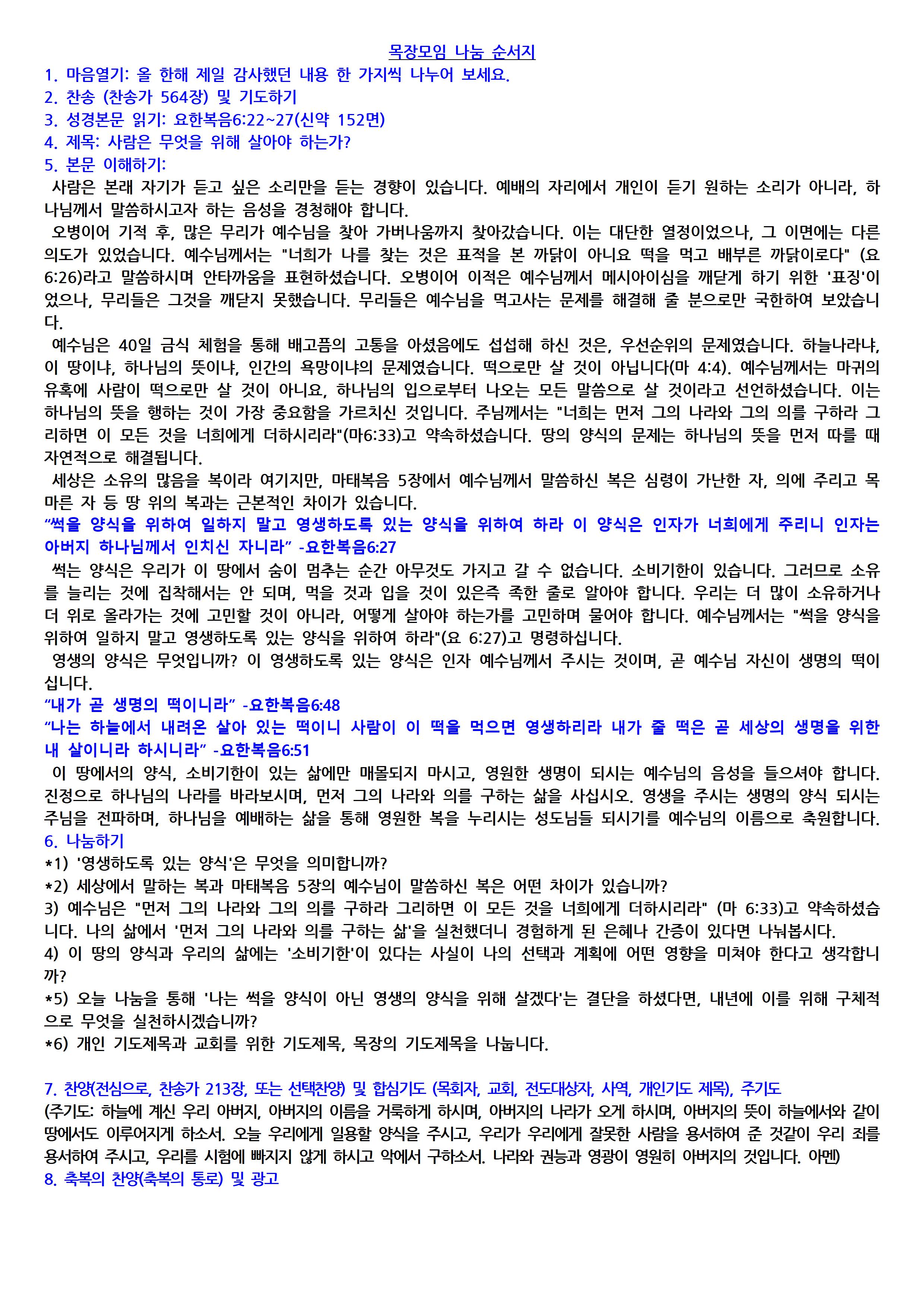 목장모임 순서지입니다.(요6사람은 무엇을 위해 살아야 하는가?)